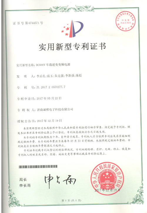 濟南誠雅電子科技有限公司自主研發(fā)生產(chǎn)的DC600V車載逆變電源榮獲國家實用新型專利證書